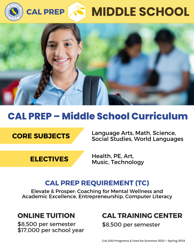 CAL PREP Middle School is committed to providing our students with the best possible education and preparing them for success. Our program not only focuses on building scholastic aptitude but also on developing individuals who are well-equipped with the necessary skills they need to excel in any field. We offer a wide range of extracurricular activities and opportunities for students to engage with their community and develop essential social and leadership skills.